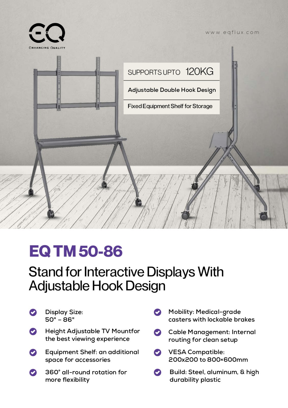 Description for EQ TM 50-86 Stand for Interactive Displays | Fits 50" - 86" | Adjustable Hook Design
